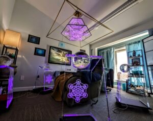 The space also incorporates subtle environmental elements—sometimes referred to as tachyon-based materials or subtle organizing energy fields (SOEFs)—